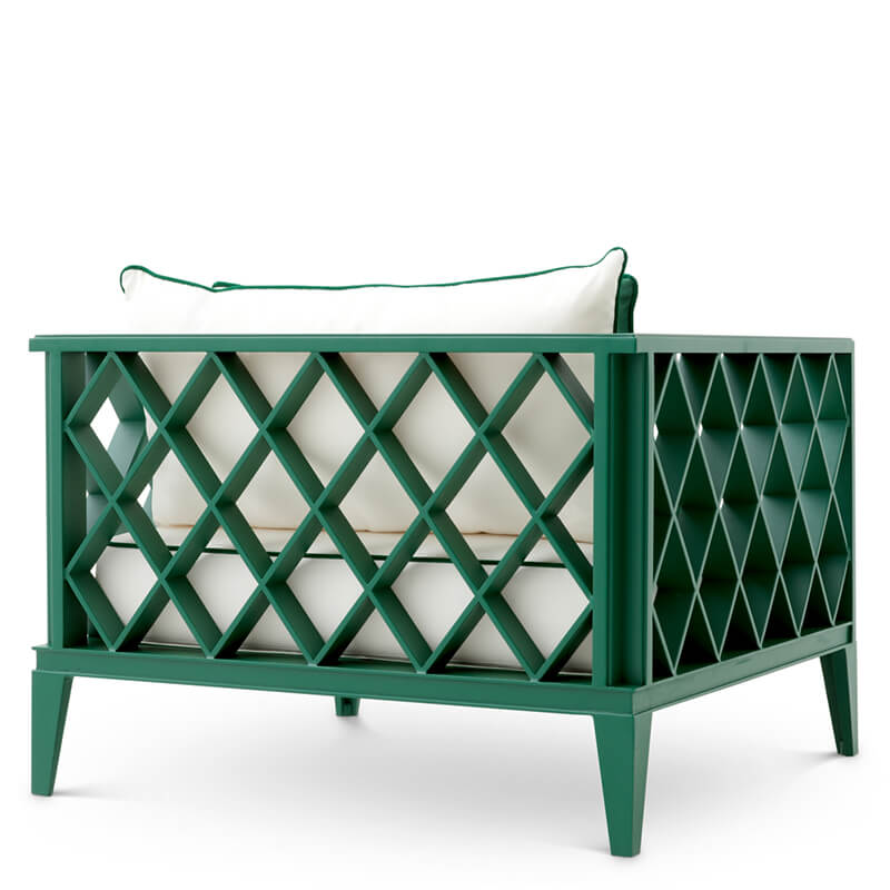This Premium Eichholtz two-seater sofa features soft beige upholstery and a striking green frame. Its refined design and plush Florent green stripy cushions offer the ultimate outdoor living experience, inviting you and your guests to relax in stylish comfort. The cushion covers are finished with contrast piping. This sofa is perfect for those who seek timeless beauty in their outdoor oasis. This series is available as a two-seater, three-seater, chair and planter—all in three colour combinations.